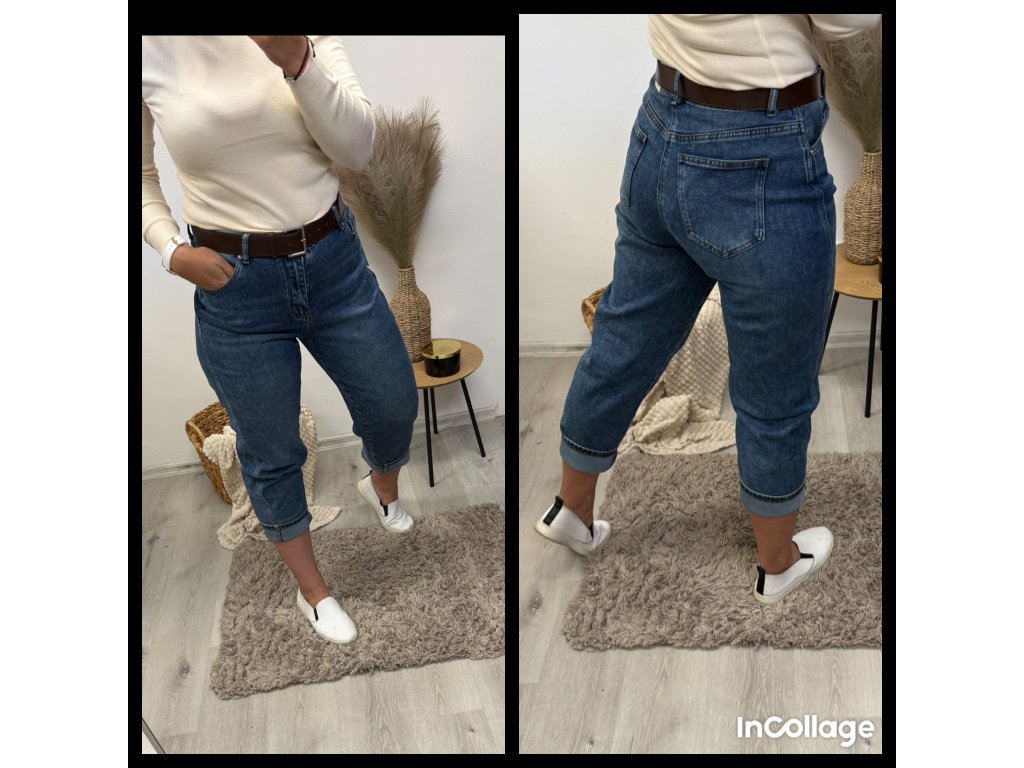 👖 Styl: Ležérní, pohodlný střih typu „mom jeans“ – volnější přes stehna, zúžený ke kotníkům