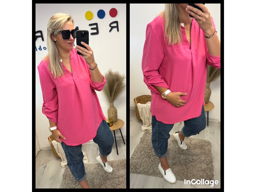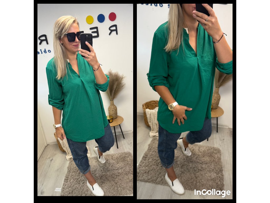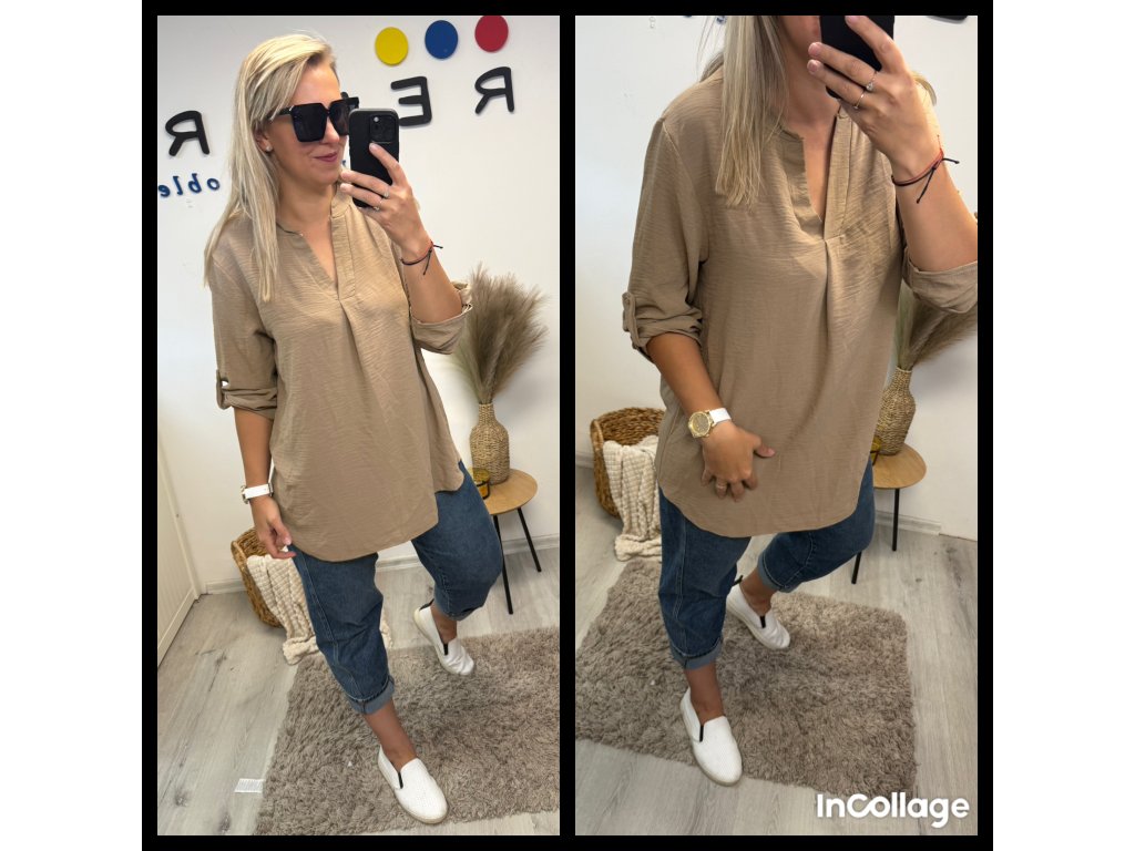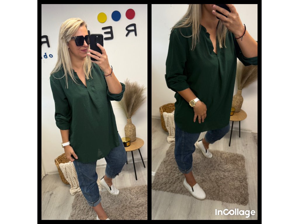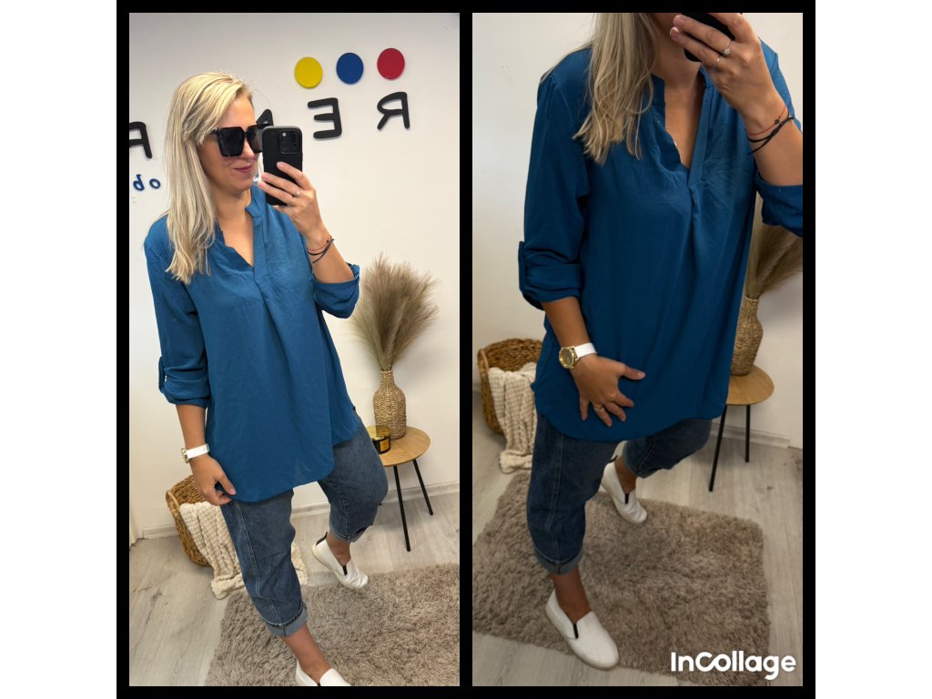 💡 Detaily: Výstřih do „V“ bez zapínání, rukávy s možností ohrnutí a knoflíkovým upevněním