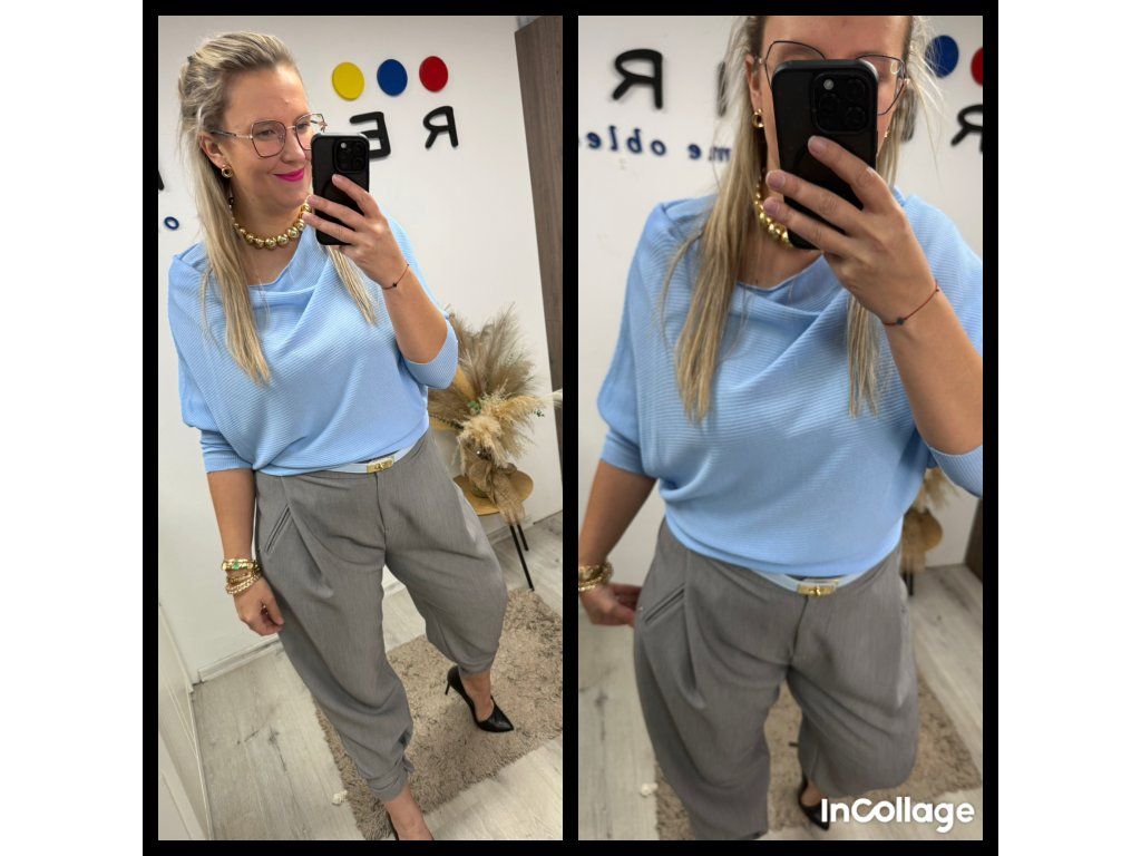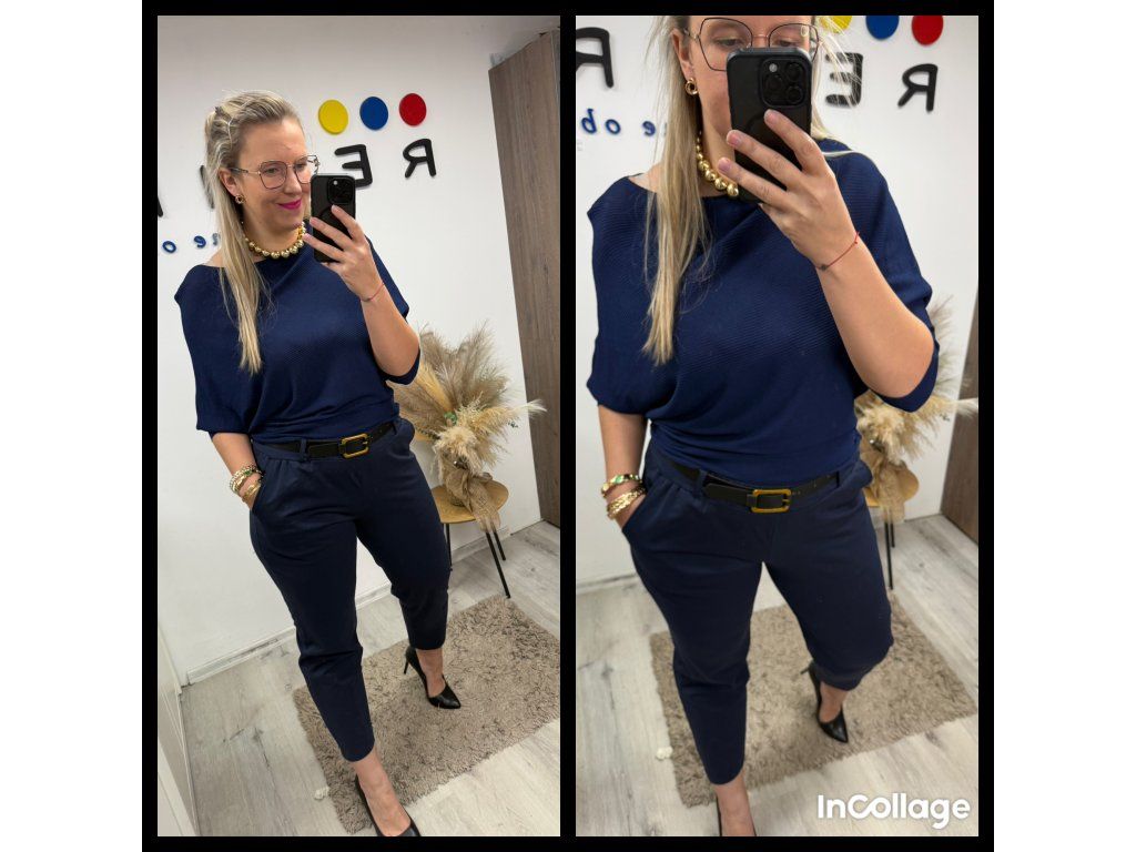 Zúžený pas, netopýří střih a přesně ten typ vršku, který s kalhotami do pasu vypadá naprosto božsky 🖤💙
