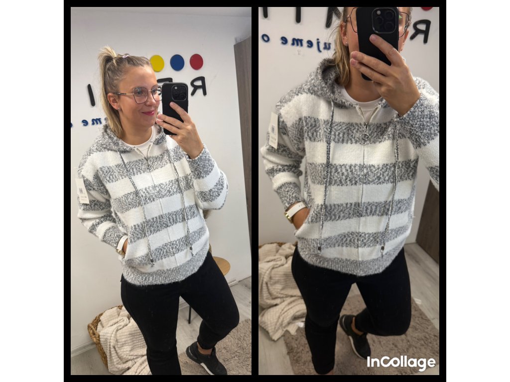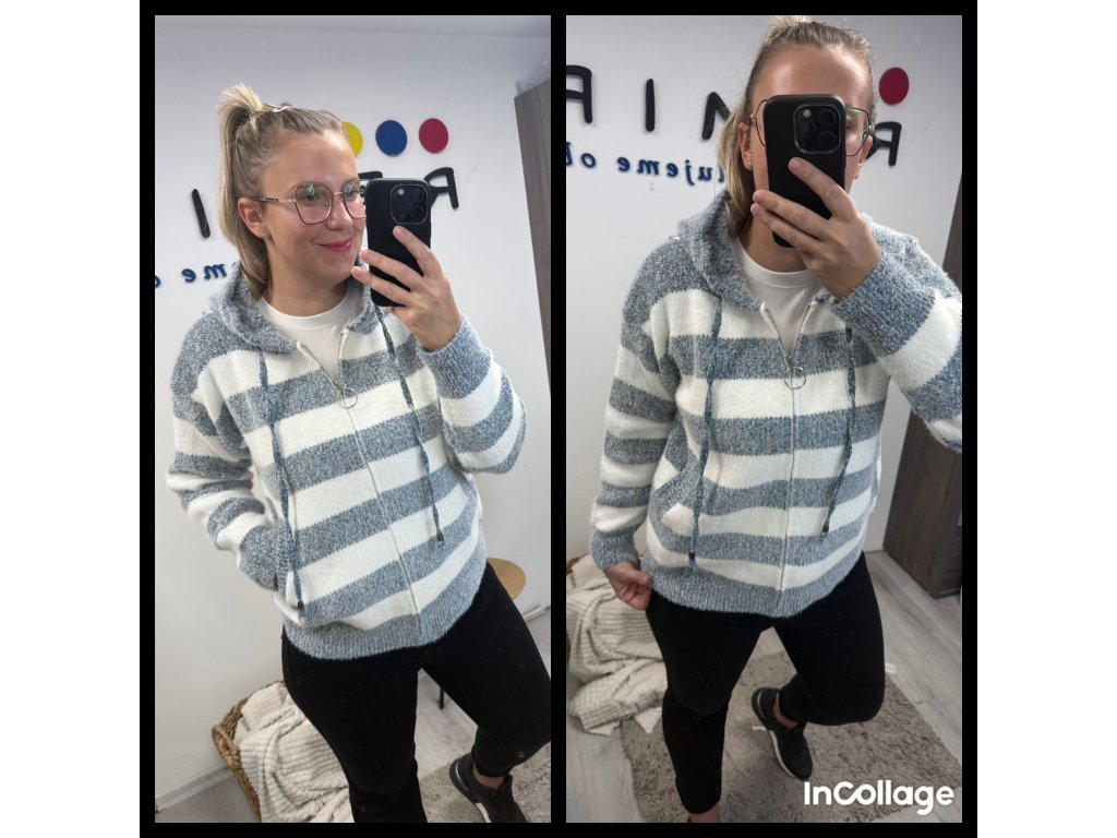 ✨ Detaily: Kovový kroužek na zipu, kapuce se šňůrkami a decentní melírovaný vzor v pruzích.